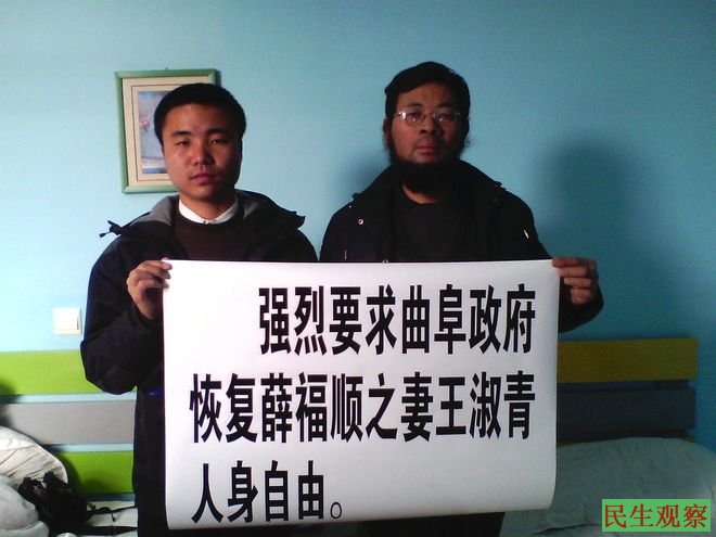最新消息:今天下午近二点在徐州的薛福顺公民声援团按计划兵分二路,一路留守驻地徐州乐家宾馆,包括秀才江湖、小彪、贾榀、杨崇、徐知汉、程广瑞、单利华、刘喜珍等人,另一路到曲阜去,有黄宾、郭建和、马胜芬、冉崇碧、刘辉等十余人。
