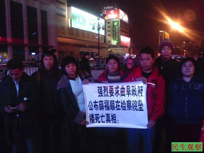 今天晚上,黄宾、郭建和、马胜芬、冉崇碧、刘辉等从徐州过来的观察团成员到达济南,与这里的多名人员汇合,人数达到二十多人。到济南火车站后,张圣雨、郭建和、马胜芬、冉崇碧、刘辉,余建芳就在火车站进行了举牌活动,要求公布薛福顺死亡真相。