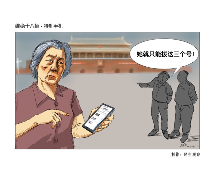 今年“六四”敏感日期间,作为“天安门母亲”之一的丁子霖老师被国保上门通知,从6月1日起上岗并停电话,并给她了一部专用的“特制手机”,这部手机只能拨打3个号码:120,儿子和国保。