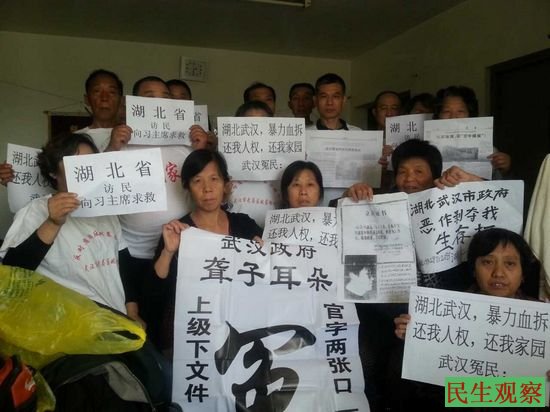 民生观察工作室2013-9-24消息:近日,武汉市武昌区姚家岭二十多名拆迁户集体抵京上访。据武汉维权人士童斌介绍,他昨天已接到拆迁户们抵京的消息。今天上午,这批拆迁户到了公安部进行控告,但没有任何结果。拆迁户们还说他们遭到推诿,只好举标语以示抗议。
