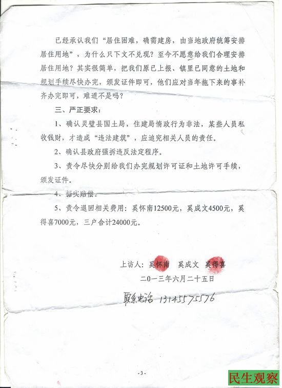 安徽灵壁县奚怀南等遭强拆 官方承认有“瑕疵”不改正