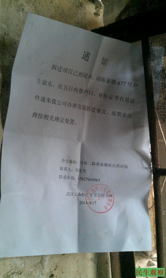 陈家墩677号户主俞东,3月17日又接到逼迁通知书,一场恶战又将开始。