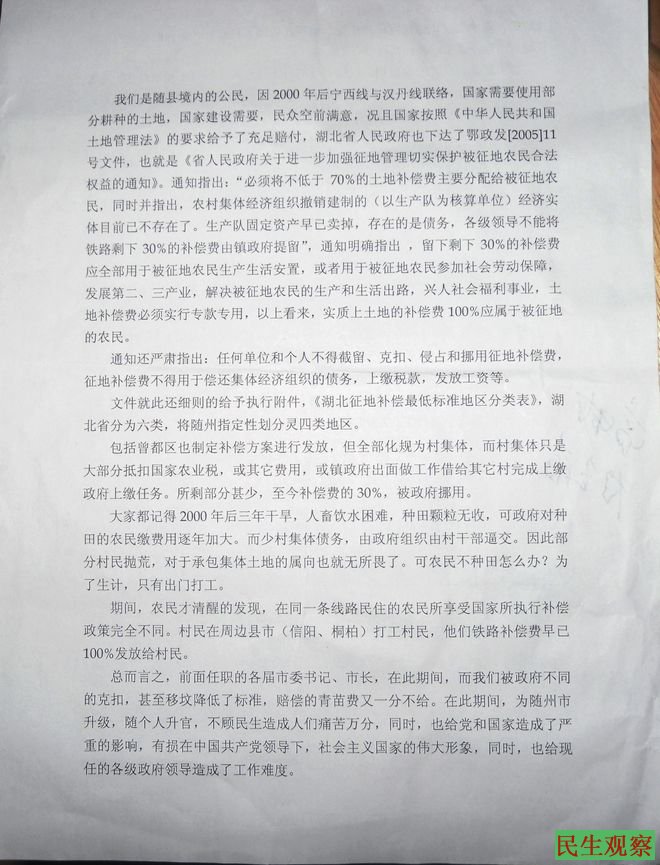 湖北随县宁西铁路线被占地农民诉补偿款被克扣