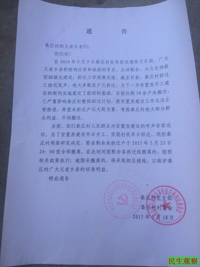 经过不断“做工作”,2015年5月18日秦庄村委会发布通告说,现在还有五十户居民拒绝搬迁,勒令5月23日前必须搬迁。秦培松说他至今未签署拆迁协议,更未搬迁,主要是补偿未谈好。事实上拆迁办和村委会为了实现村民搬迁的目村,确实想了很多招,包括断水断电。秦培松说他家房子被断水断电至今达半年了,家人也没办法在房子里住了。
