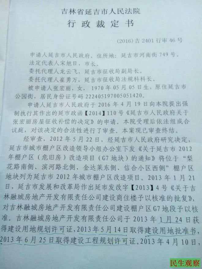 今天,张宏丽说她刚刚要到了延吉法院的裁定,称明天就要对她家房子进行强拆。张宏丽表示她还是相信法律,今天下午正急着赶往法院进行上诉。