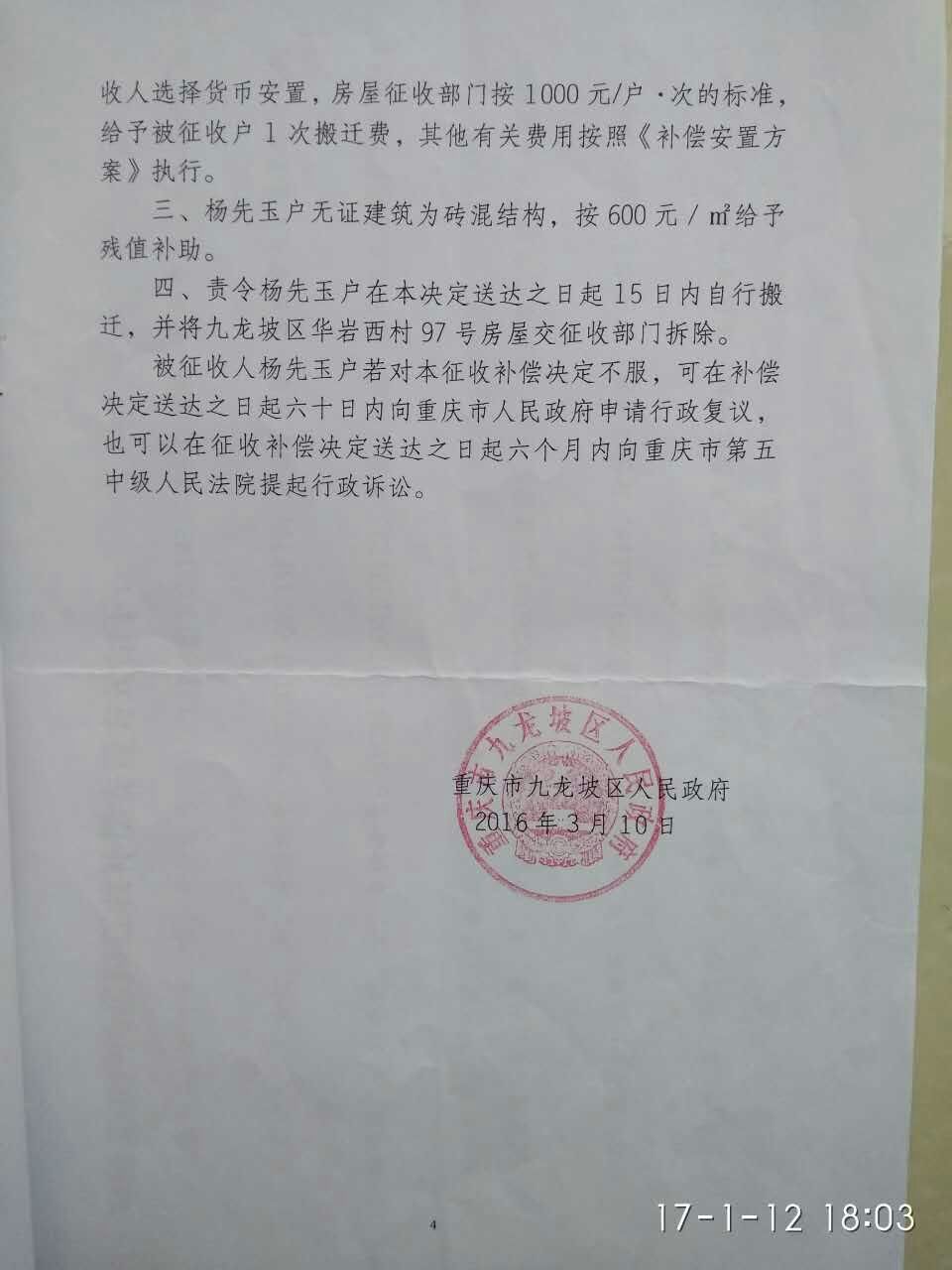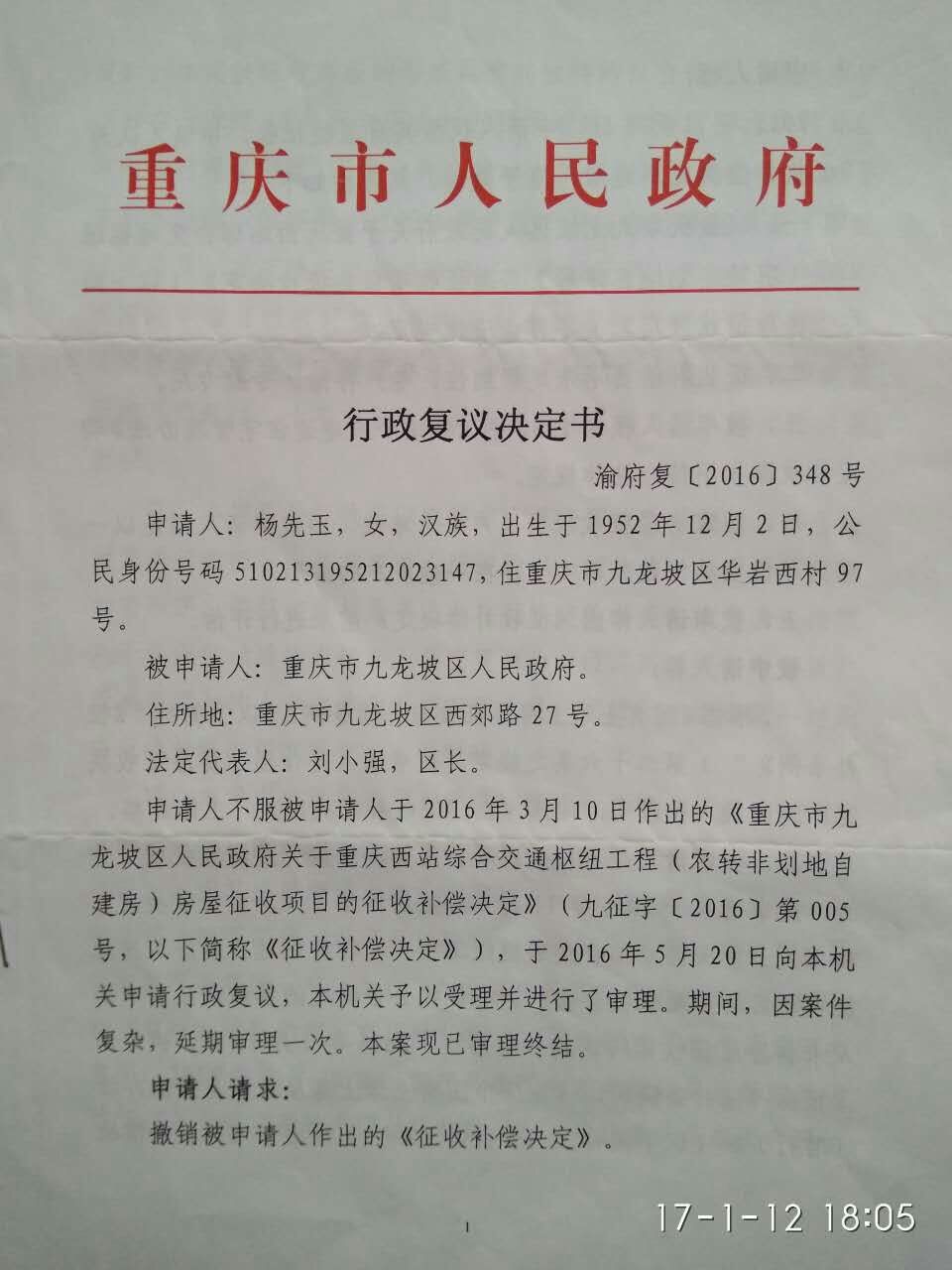 杨先玉的家人说:“强拆是九龙坡区政府决定的,在强拆之前,九龙坡区政府并没有履行相关公告和告知等程序,只出具了一份拆迁补偿决定书,并把我家好好的房子鉴定为危房。我一家不服补偿决定向重庆市政府提出复议,重庆市政府审查后认为,九龙坡区政府没有履行相关程序,撤销了区政府作出的补偿决定,责令区政府重新作出具体行政行为。但九龙坡区政府又给了一份同样的补偿决定,我们再次提起复议,复议决定还没出来便强拆了我们的房子。我向所有政府部门反映了此事,现在重庆市九龙坡区政府正在对九龙坡区房管局进行调查。”