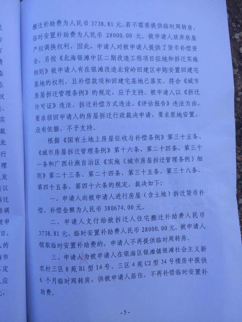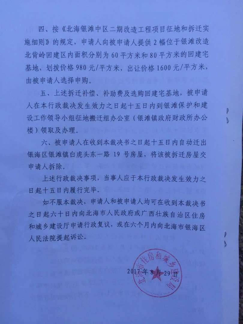 《裁决书》指,被申请人(村民)在收到裁决书后十五天内自动搬出并将房屋交给申请人(拆迁方),如有不服,可以在六十天内向北海市政府或广西住建厅申请行政复议,或在六个月内在北海市银海区法院提起诉讼。