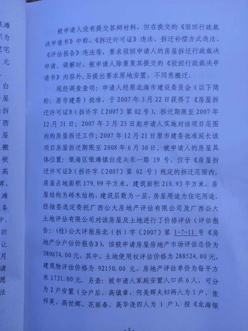 【民生观察2017年8月31日消息】本网获悉,广西北海市银海区银滩镇白虎头村村民高镇章、林瑞兴、林绍玉于昨日(8月30日)下午分别收到北海市住房和城乡建设局发出的《房屋拆迁行政裁决书》,细读之下发觉该裁决书的定价依据竟然来自于2007年时所作的房屋评估报告。
