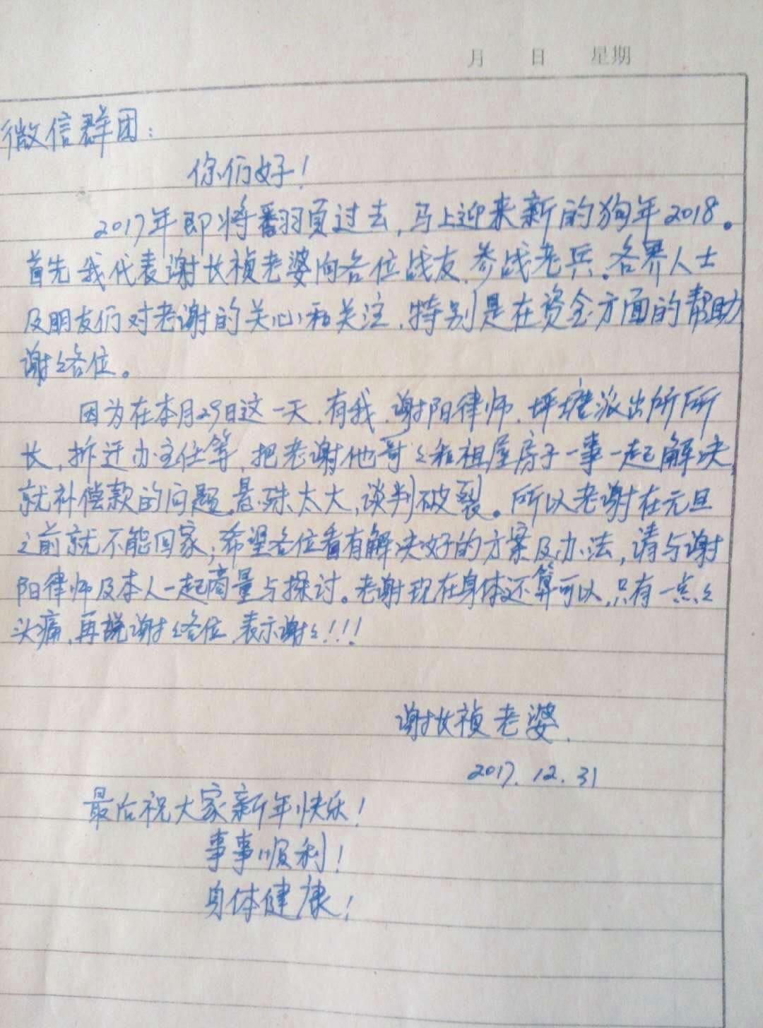 同时,本网还联系了该案辩护人也是谢长祯好友的谢阳律师,他表示正在积极寻求解决方案,希望政府方面和谢长祯双方都能妥协让步,争取尽快解决问题,让谢长祯能早日离开看守所,与家人团聚。