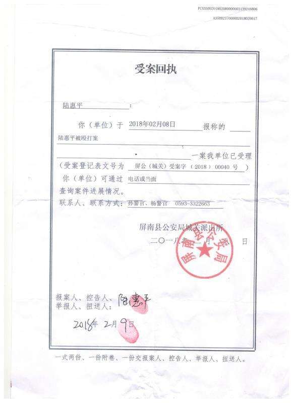 2月7日下午,陆惠平到城关派出所做笔录,又遭到屏南公安局副局长黄志约当着众警察面掐脖子殴打。家属透露,黄约志殴打陆惠平的原因是:“陆惠平曾向有关部门控告黄志约,在2017年11月1日早上带队开着四辆警车,破门而入抓走陆惠平后,再次非法拘禁。”此外,屏南公安局副局长黄志约殴打过陆惠平后还威胁她说:“如果再控告我就对你不客气,并要整死你。”陆惠平立即要打12389督查察电话报警,被7、8个警察强行制止,并将其拖到关押嫌疑犯的房间,关押到9号中午。后来城关派出所指导员出面说:“只要你们家人愿意配合把征地协议签了,陆惠平就不用拘留,否则就拘留10天。”陆惠平不肯屈服于公安的辱骂殴打及恐吓,坚决不肯在“征地协议”上签字,于是她便被宁德屏南公安局以“扰乱单位秩序罪”行政拘留十天。