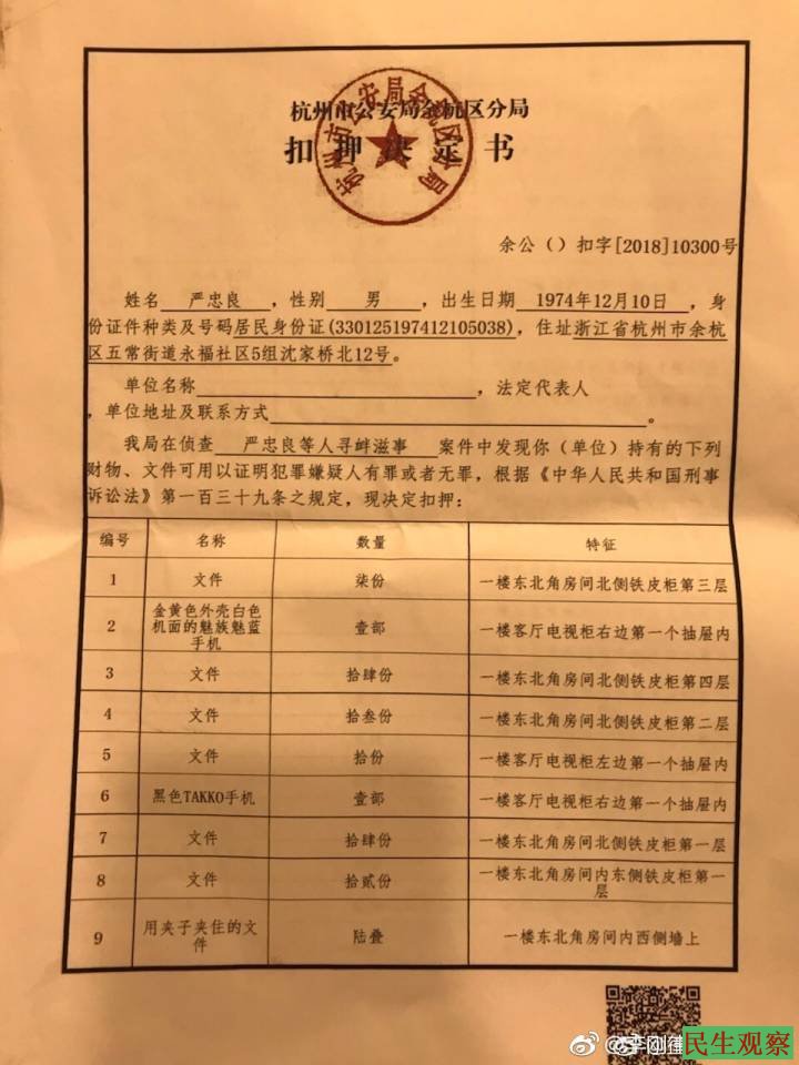 从扣押清单上看到,李全女被扣押物品达到30件,而严忠良被扣押物品达到35件之多,其中包括信访诉讼材料、光盘、硬盘、电脑主机、手机等物品。随后,在2018年4月中旬三人均被杭州市检察院批准逮捕。三人被杭州警方指控涉嫌“寻衅滋事罪”,但三人均不认为自己的行为构成犯罪。目前三人在拘留所身体状况良好,心理状态稳定且积极乐观。