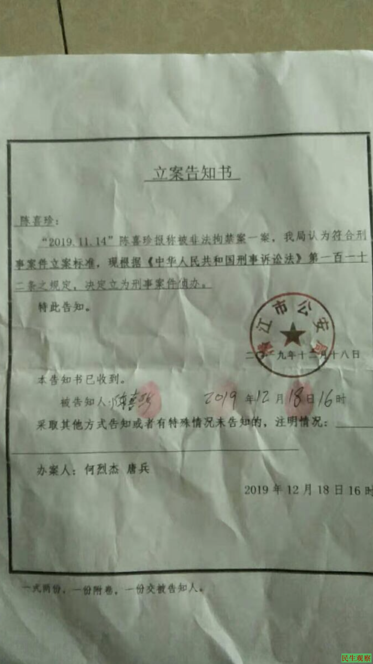 【民生观察2019年12月25日消息】湖北潜江市经济开发区信心村七组的村民陈珍在2019年7月18日,陈喜珍在信心七组的家被非法强拆。7月27日深夜陈喜珍被村霸王育凯带领3名村委会的人,从潜江拘留所狱警老徐勾结黑恶人员,强行非法绑架将陈喜珍交给村霸当着拘留所的人殴打陈喜珍,当事人呼喊救命,观察员了解情况后询问了当事人。