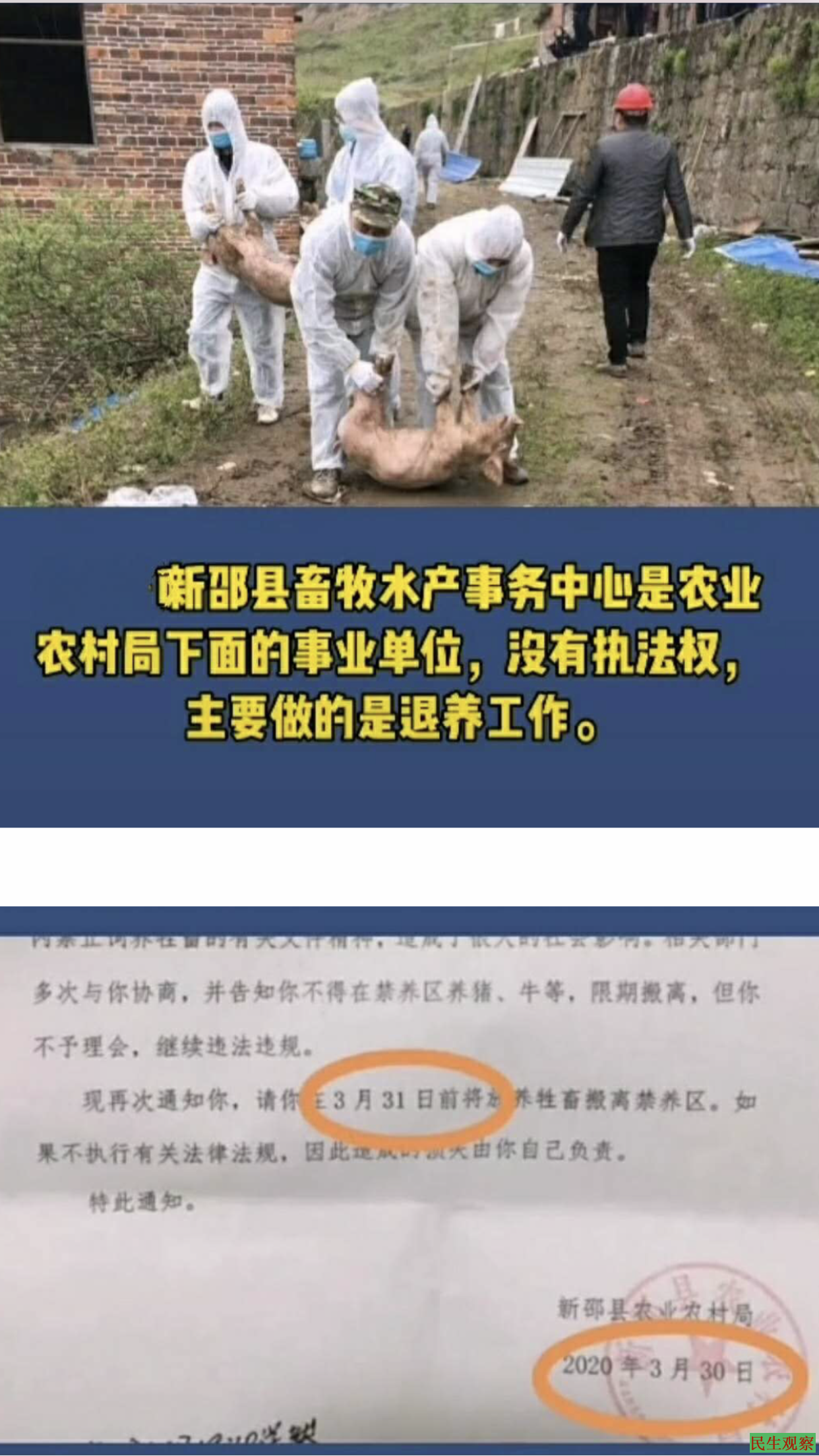 【民生观察2020年4月9日消息】本网获悉,3月31日,湖南新邵政府强拆一村民养猪场,拆除通知于30日晚上6点才发给村民,仅隔一夜时间,在31日早上7点政府即来强拆,完全没有给养殖户处理的时间及准备。由于毫无准备,强拆导致许多生猪被打伤,养殖户曾先生损失惨重。4月6日,曾先生找到法律人士咨询获悉,根据《畜牧法》、《国土资源部、农业部关于促进规模化畜禽养殖有关用地政策的通知》规定:“畜禽养殖用地实行分类管理,畜禽舍等生产设施及绿化隔离带用地,按照农用地管理,无需办理建设工程许可证”。据此,曾先生准备起诉当地政府。