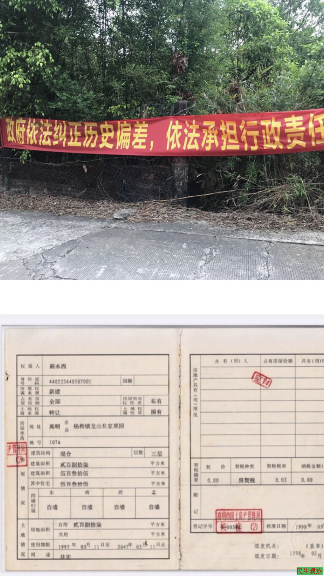 【民生观察2020年4月18日消息】20多年前,为响应佛山市高明区(原高明市)政府号召,克服各种困难,积极投资荒山秃岭的杨和镇(原杨梅镇与杨和镇)万亩私家果园建设,政府给办了土地证,部分办了房产证(期间政府暂停办),按政府样板房盖起了两到三层的房屋,种上了果树。