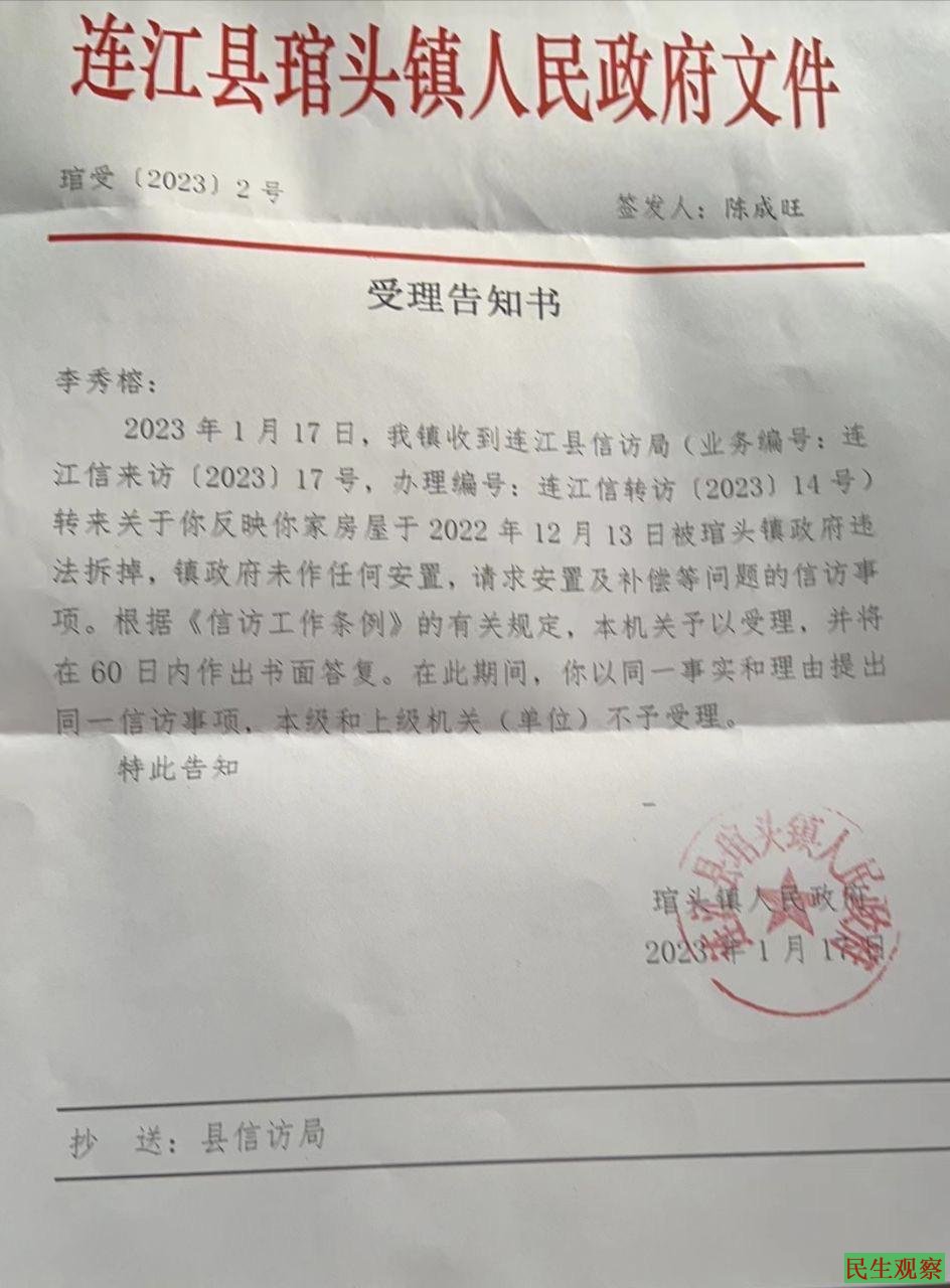 李秀榕夫妇强烈不服,就将琯头镇政府偷拆其房屋的违法行为,向上级政府连江县投诉反映,根据信访条例属地管理原则,转给琯头镇政府办理,该镇于1月17日书面告知,已经受理了李秀榕的诉求,并定在60天内办结。