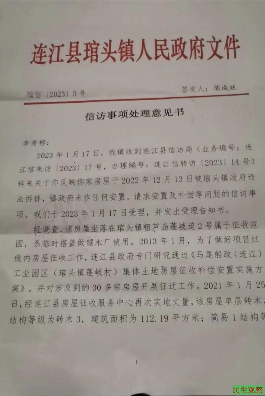 3月22日,李秀榕在提出“房屋被政府偷拆”信访事项63天后,才收到连江县琯头镇政府作出的琯信【2023】3号《信访事项处理意见书》。该《意见书》写明:“经调查,该房屋坐落在琅头镇粗芦岛蓬岐道2号,属于征收范围,……。2013年1月,为了做好项目红线内房屋征收工作,连江县政府专门研究通过《马尾船政(连江)工业园区(琅头镇蓬岐村)集体土地房屋征收补偿安置实施方案》,并对涉及到的30多宗房屋开展征迁工作。……经估算,该房屋评估补偿总价值为107401元。截止目前仅剩你户因不满意补偿费,未签征收补偿协议。关于你所述的房屋被政府违法拆掉事项,经核实,我镇没有组织拆除该房屋。关于该房屋的补偿款事项,镇、村一直在依照相关政策积极努力与你户协调,在合理、合法的原则下共同妥善解决该事项“。