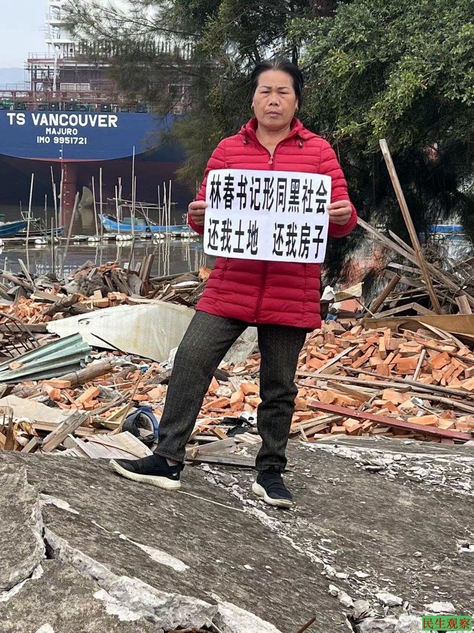 李秀榕和丈夫李振文虽强烈不服,但在强权逼迫下,无法正常生活,只得离开故土,“润”去美国求生。在即将成行前夕,李秀榕回到片瓦不存自家房屋废墟上,举牌上写:“林春书记形同黑社会,还我土地,还我房子”,不甘地对琯头镇偷拆房屋不认账行径表达强烈愤慨!