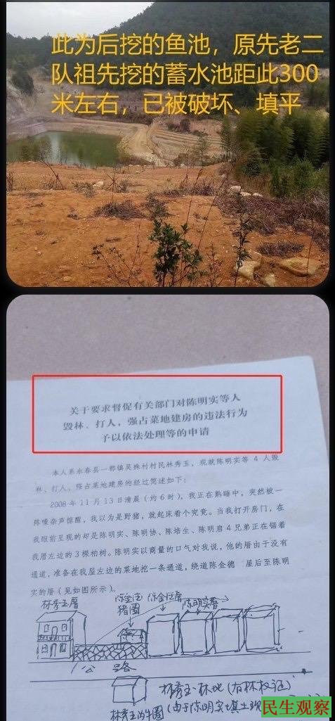 【民生观察2023年4月28日消息】福建省泉州市永春县一都镇吴殊村村书记陈明植暴力强占村民土地,村民上访十余年问题仍不被解决。该村书记涉黑涉恶,强占土地,破坏耕地上百亩,被多名村民声讨。