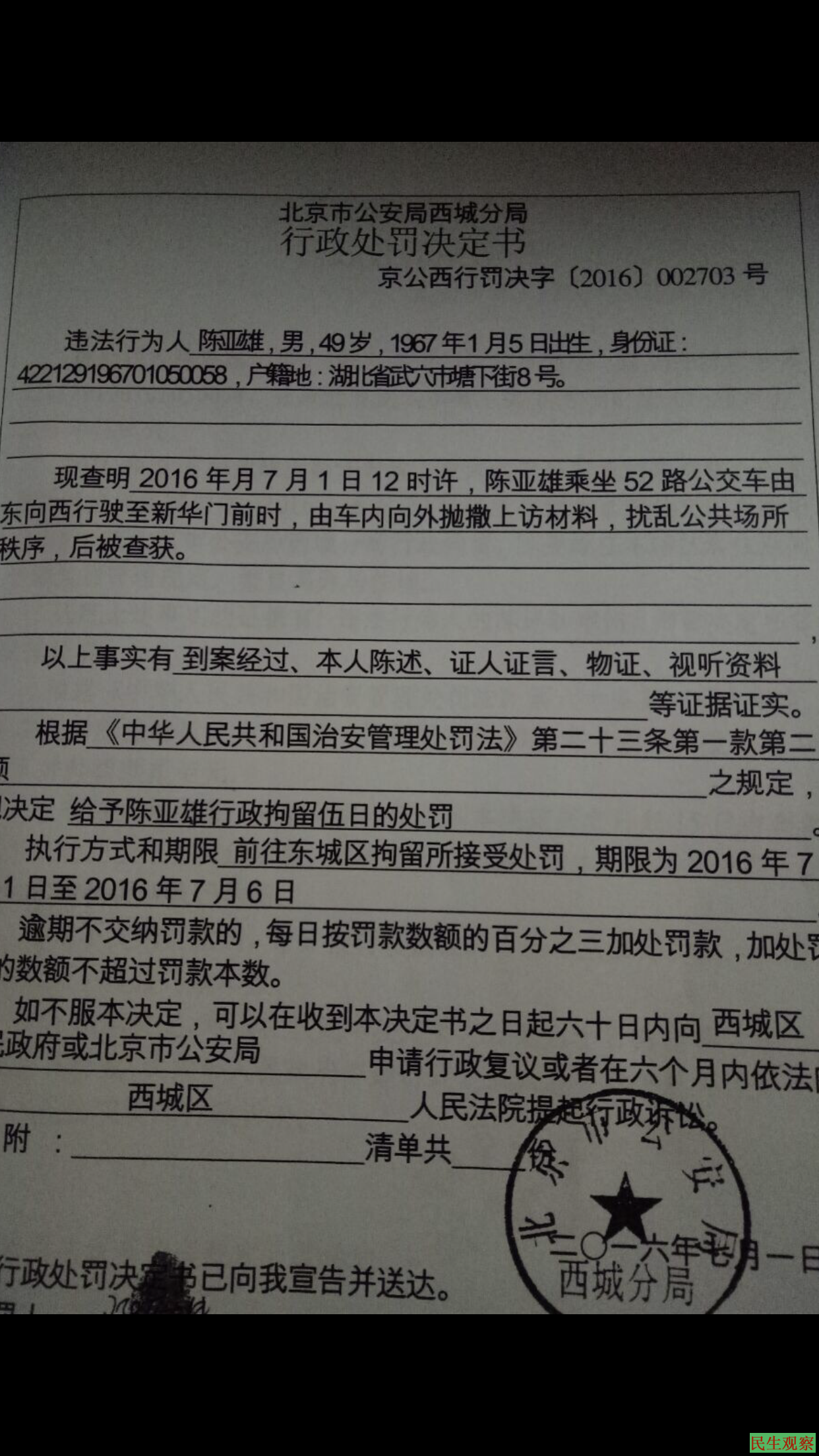 2016年7月1日行政拘留5天。