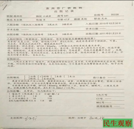 2007年10月6日强制送进苏州市广济医院(精神病院)治疗了一个月。