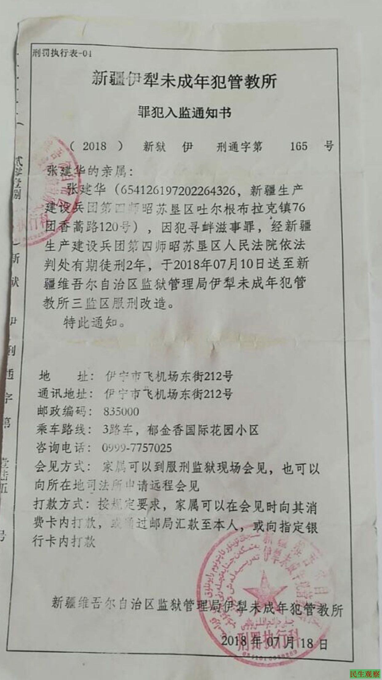 举报人张建华写认罪书并在2018年2月13日晚将举报人送进伊宁市看宁所,同年3月份昭苏垦区检察院的检察长第一次来提审,举报人问检察长要家人犯了学习班那一条,为什么要抓我家人,回答说我不知道你家人在学习班回去问问于是退捕了。4月份第二提审换了人捡察官,上来便说:"听说你的口才很好但在我这没用,不准提你家人在学习班,如果你要提你家人在学习班,你想把你家人迁址进来那我们就把事情搞大让你家人全都坐牢”被逼无赖为了家人的安危举报人张建华只好认罪保全家人。他们为了逼我入狱从我进看守到判决书下来只用了5个多月的时间在2018年5月17日就做出了(2018)兵0403刑初3号的刑事判决书,还不让我上诉如果上诉家人不放直到上诉期过才把我家人于2018年5月26日放了。家人被放之后他们还不垦罢手76团政委陈辉指使武装部派人到学习班把其家人接到76固团部开批抖大会让举报人家人当到全团职工的面认错大声读保证书这不下算,还把举报人父母房子的院子里装上摄像一头每天24小时全程监控,这严重侵犯了公民的合法权益,严重违反国家法律法规。公然挑战国家宪法和法律。