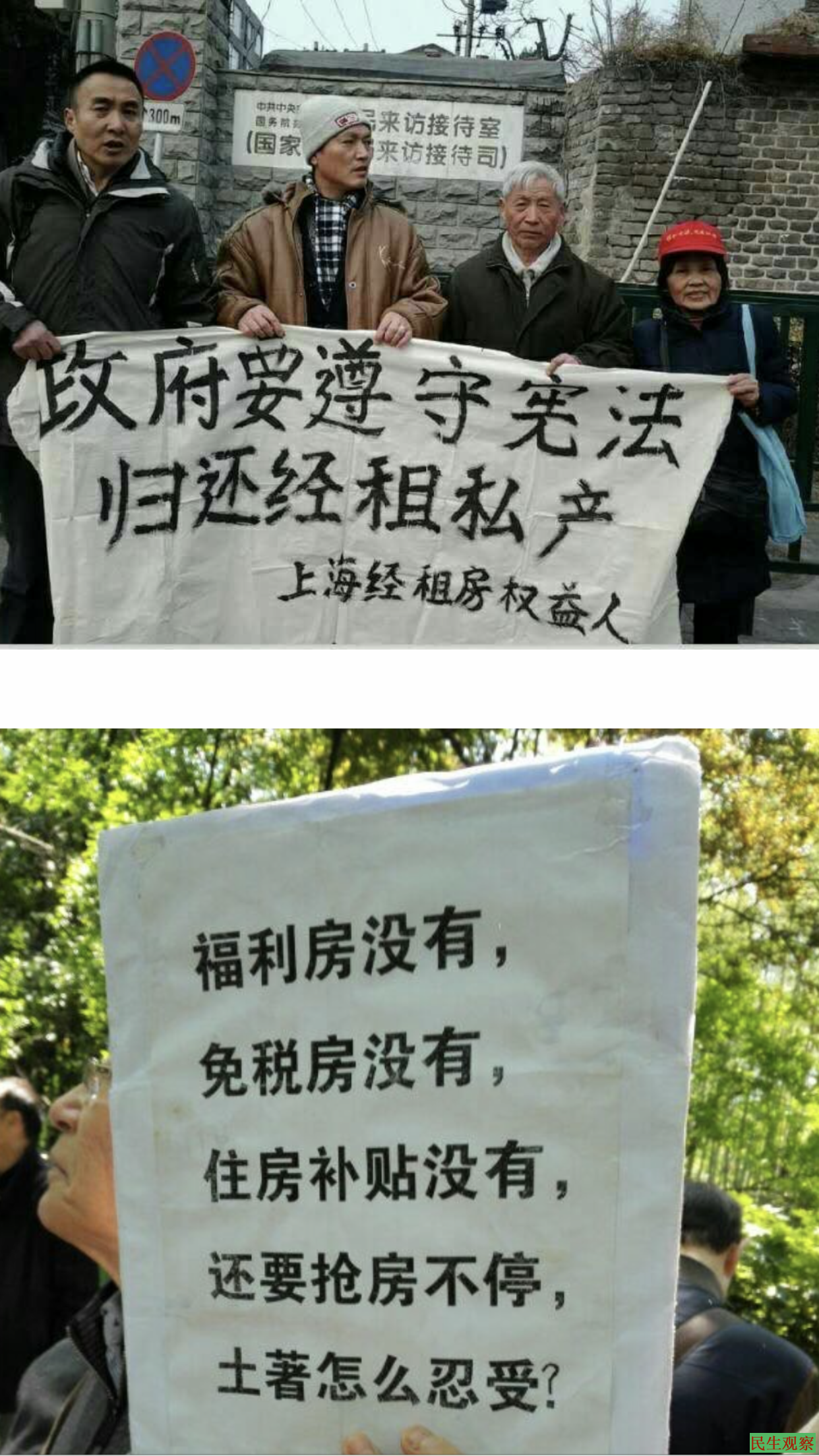 房管部门公然侵犯宪法,中华人民共和国还有哪条法律,还有哪条宪法,还有哪个国家政策能像中国这样的强取豪夺的强拆?!我们没有任何错。我们也是在维护自己的权利。全国经租房主同心。2020年8月19半夜三更先打电话询问是否要上北京,随后警察又上门来问上海讨房团申援平遥的签名的亊,老百姓的财产被掠夺没人负责,政府抢公民百姓房子的问题不解决死人不管,老百姓依法维权却遭到警察电话与警察上门维稳,甚至还有牢狱之灾。