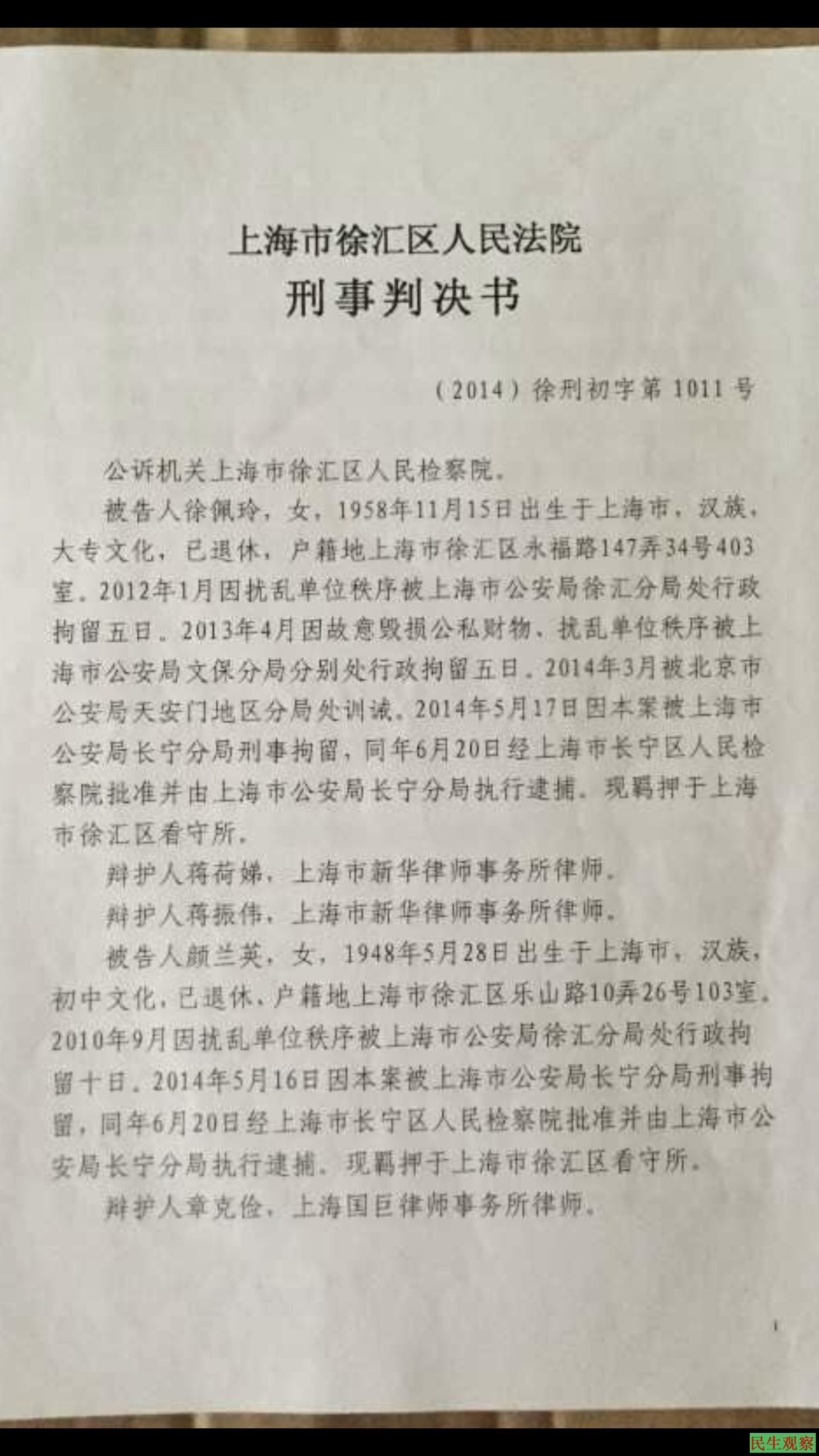 2012年1月在上海市卫生局以扰乱单位秩序被上海徐汇公安分局处行政拘留5日;