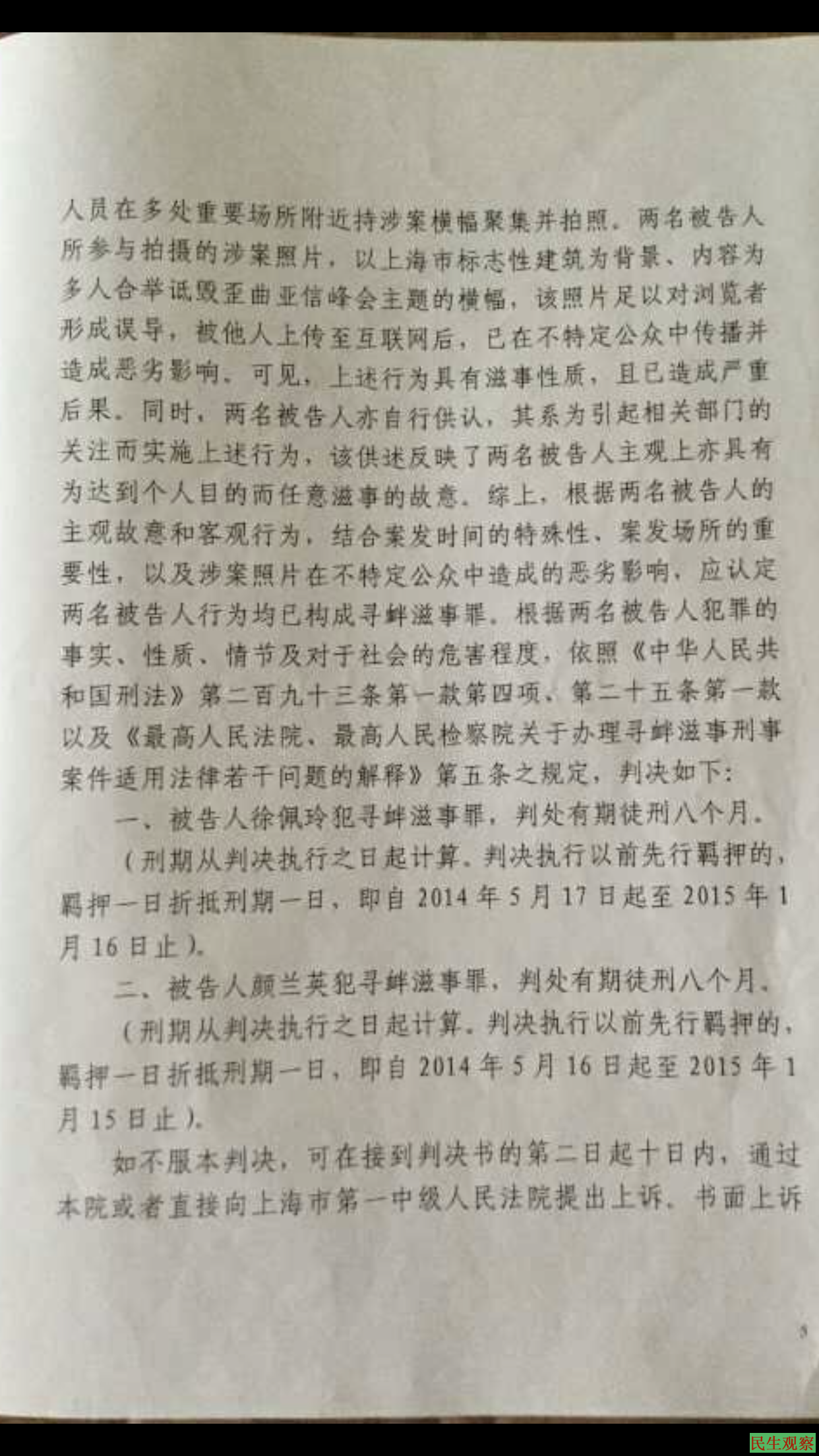 2014年12月因举牌要求习近平关注人权被上海徐汇法院以寻衅滋事罪判处有期徒刑8个月。