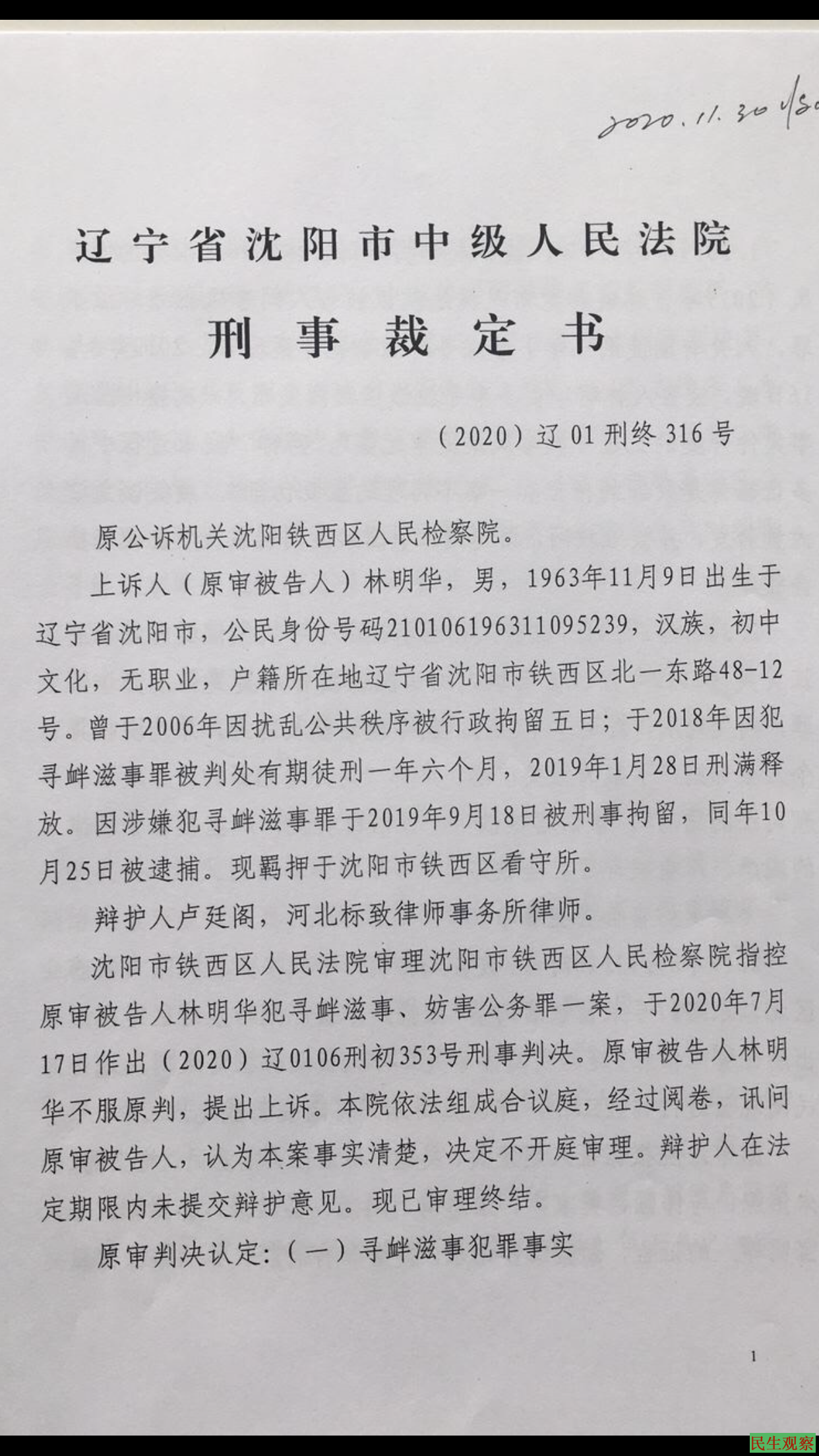辽宁沈阳市林明洁,林明华兄弟因上访获罪,林明华一审被判3年,林明洁被判5年,二审维持原判。