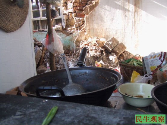 从2012年6月25号至今,我和老伴就一直在这座漏雨的房子里吃住。我们不明白自己住了好几十年的房子一直安安全全,好端端地因为拆迁被人破坏成这个样子。我们平时从没得罪什么人,了解情况的人都说心知肚明是谁指使这么干的。