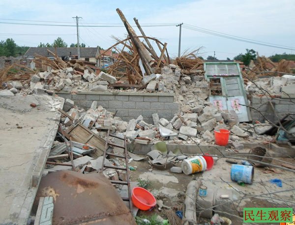我们正在接受治疗的时候,2013年6月18日晚上8点40分,两辆没挂牌子的黑色轿车和一辆面包车外加一辆装载车上装着一辆大挖掘机,带着二十多个人手持棍棒,围住我家房屋周围,把房子用挖掘机铲平。村里人不敢靠前,我们家中的东西全部被砸毁在里面。接到村人告知,我们赶回,房子早已成为废墟。我们报警多次,警察一直没出警。他们说那是政府行为,他们管不了。
