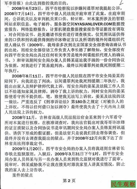 吉林四平许冰涛不服“间谍”判刑 母亲为其上访