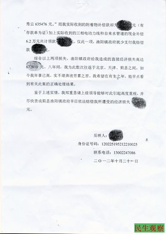 天津养鸡户马秀云鸡场被占未获合理补偿的反映信