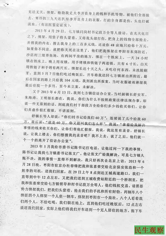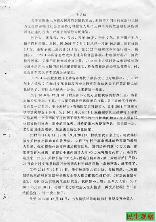 湖北省枣阳市张作云就被非法关押殴打的控告信