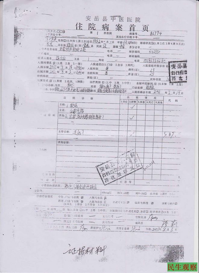 控告人肖时英为此纠纷走遍了半个中国得不到正确答案,在2012年6月20日 ,在福建省邵武市法医鉴定所,得到了正确答案,经福建省邵武市法医审查,在2011年7月18日,当时入院照的DR片和病历,据法医介绍2011年7月18日,照的DR片来看,百分之百左肩有严重性骨折,但是从2011年7月19日,出的报告单上肖时英左肩没有任何骨折,只有左桡骨小头陈旧性骨折,这很明显是安岳县中医院故意作假。四川省资阳市安岳县中医院,在第二天,2011年7月19日,下午5点多钟,再次照DR片,从2011年7月19日,照的DR片来看,肖时英左肩看不出任何骨折,2011年7月20日,出的报告单上也没有任何骨折。这一切都是被控告人唐成学买通四川省资阳市安岳县中医院,主治医生被控告人蔡颐和被控告人放射科医生周泽一起故意伪造报告单和伪造病历的违法行为。