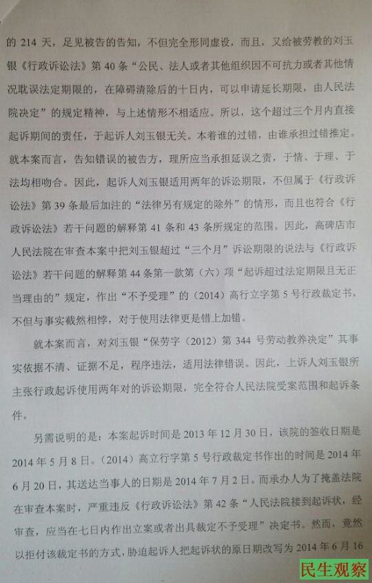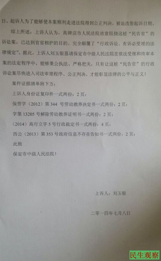 河北高碑店市刘玉银状告保定市劳教委