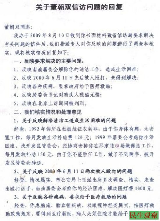 再次申请回复人:董朝双,男,现年58岁,汉族,初中文化,系二级残,住七里镇海棠村三组。