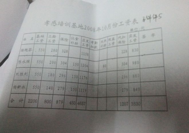 2014年基地买社保,在12月份社保单上有6人,而在单位上班的只有2人(我和税光美),其他4人(韩本华、张承荣、汤菲、向琪)在2013年年底及2014年开年就已经辞职,费用单位全出,而我们在单位上班的反而还扣钱。