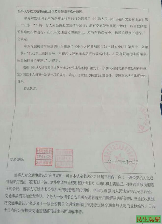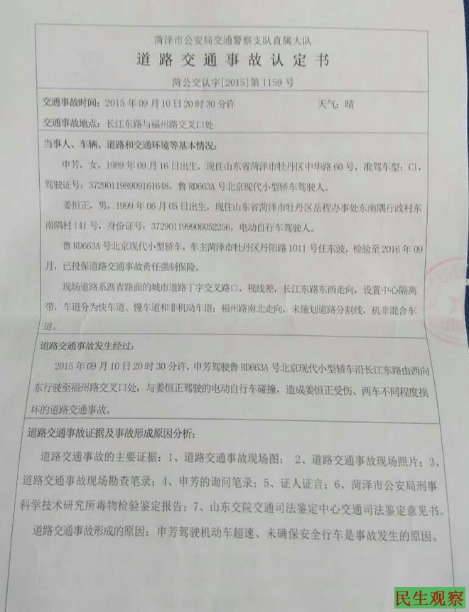 2015年9月10日晚8点30分,在山东省菏泽市长江东路与福州路的交叉口处发生了一起严重的交通事故。肇事者申芳酒后驾驶鲁R663A现代轿车以93km/h沿长江东路由东向西超速行驶,在与福州路的交叉口处将骑电瓶车过斑马线的16岁的姜恒正撞成重伤。申芳负全责。而在这起看似简单酒后肇事的交通事故里面却一波三折,耐人寻味然。