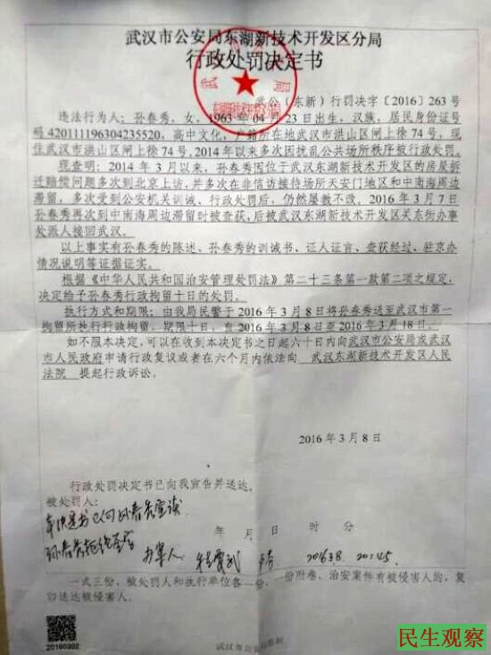 湖北省武汉市访民孙春秀从马家楼押回拘留10天18号期满出来。