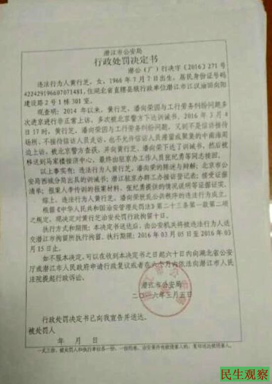 潜江工行访民黄行芝与潘向荣在两会期间辗转到很远的地方坐车逃离潜江直奔北京两会,去各部门登记后在中南海给“两会”秘书处发信件完毕途中被北京警察安检身份证是访民身份被送府右街派出所送马家楼,连夜非法押回潜江广华派出所被处罚依十日行政拘留,他们开始被依寻衅滋事罪处罚十五日拘留,最后到公安局审核后修改为扰乱公共秩序行政拘留10日处罚,3月5号到15号,结果被拘留所所长余波超时拘押了几个小时,拘留所所长余波为了讨好上级领导,擅自剥夺黄行芝与潘向荣的通讯权不让他们享受拨打电话与家人通讯权,还多次训诉她们两个人,说上访的不听话要严格管理就是不要给她们打电话等,还有万祥贵在北京“两会”进马家楼后被押送回来拘留10天,3月21号期满还在拘押中。
