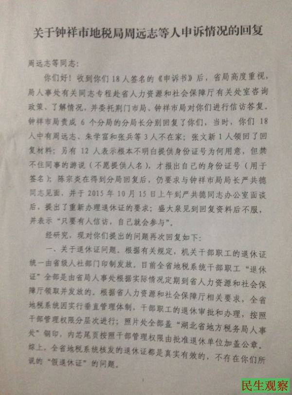 中央和省委统一部署,从2014年10月1日起,退休人员工资在社保部门领取,不由财政发放,而湖北省地税局逼退的广大干部职工拿着假证身份不伦不类,既不被社会承认,也不被国家管理机关承认,社保部门公开表示“无法确认身份”,造成身份混乱,严重剥夺我们劳动权力和应享受的国家和社会给予的各种报酬、福利、待遇等,使这些被逼提前退休人员,无法面对从事多年的税收工作部门,无法面对社会,无法面对子孙后代。为维护合法权益,维护国家机关的社会形象和正常工作秩序,特提出如下诉求: