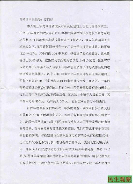 民生观察工作室2016/8/12消息:7月28日,湖北省武汉市江汉区建筑公司职工胡正秋,到北戴河诉冤被劫访人员拦截后至今下落不明。