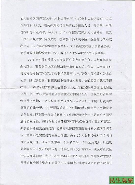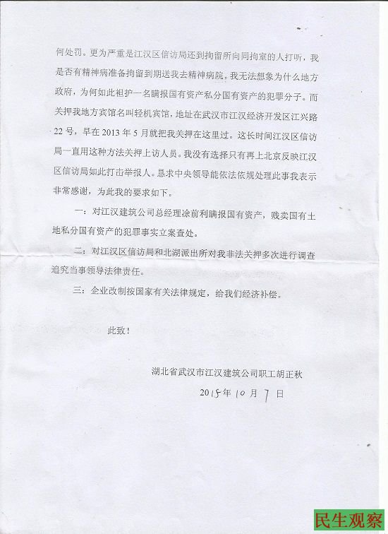 秦永敏致公安部、武汉市公