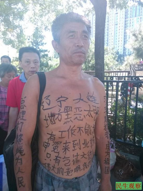 其中一辽宁访民赤裸写满冤屈的上身,到各处去维权抗议。许多来自全国各地的访民则在国家信访局门前排队等待,有序的表达自己的诉求。