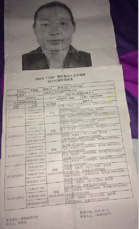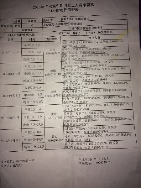 但这并不是第一次限制她人身自由,今年“六.四”期间,她就被列为C级重点监控人员,八桥鎮春晖路派出所安排人员24小时对她进行盯守,防止此期间进京上访。并列有值班表,明确时间和责任,可谓布置周密。今年国庆期间,在被数十人盯守的情况下,八桥镇党委书记刘义贵仍不放心,亲自登门力劝李朝惠不要上访,配合政府工作。