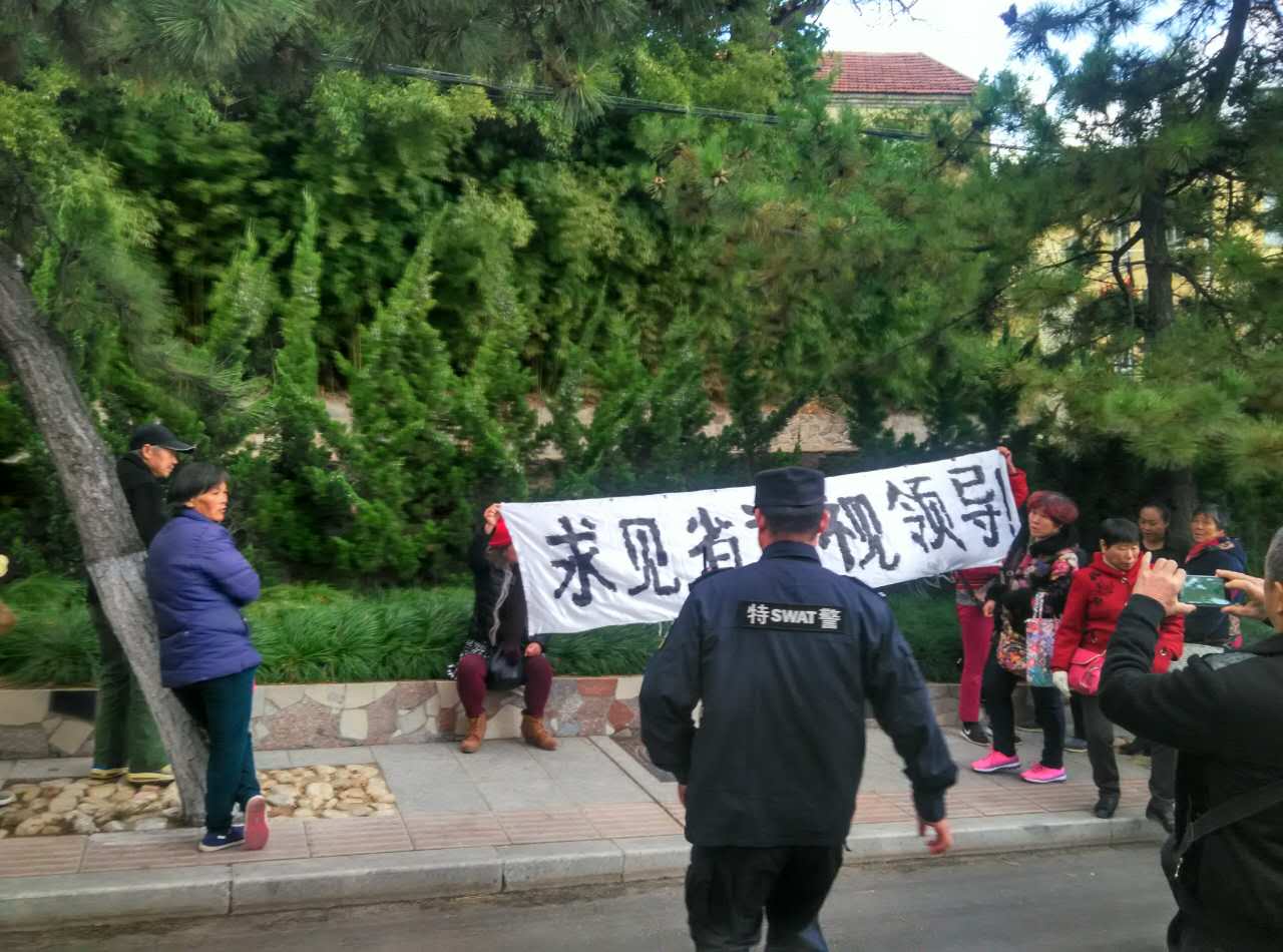[访民之声2016/11/3消息] 11月1日,山东数十访民到山东省巡视组接待室,其公开的办公地址是在威海市东山宾馆。 到现场后发现被骗,便张打横幅要求见山东省巡视组领导,遭特警阻拦。