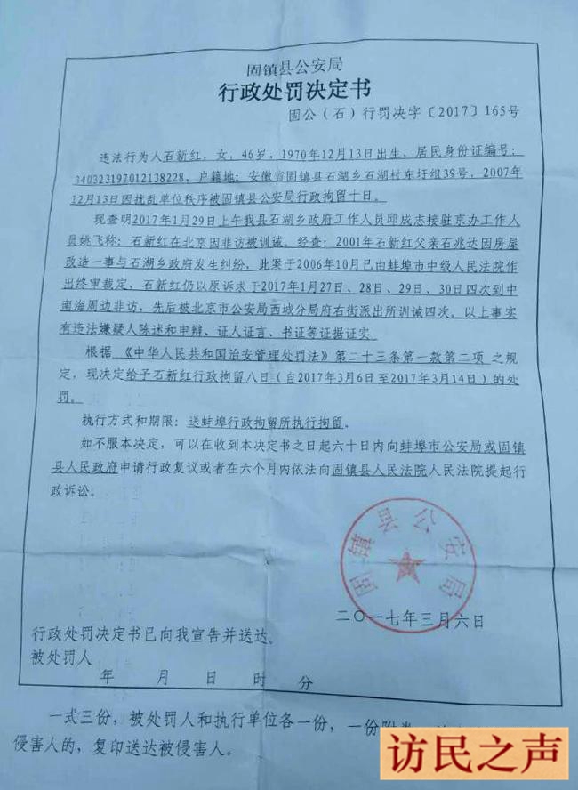 固镇县公安局出具的处罚决定书中记载,2001年,石新红因父亲石兆达房屋改造一事与石湖乡政府发生纠纷,该案于2006年10月法院已作出终审裁定,石新红仍以原诉求到在2007年春节期间4次到中南海周边非访,被北京警方训诫。