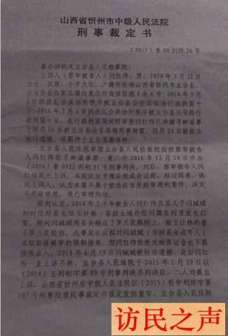 [访民之声2017/3/31消息] 2016年7月6日,山西省忻州市五台县访民闫红伟因上访被五台县公安局行政拘留10天,期满后以涉嫌寻衅滋事罪转为刑事拘留,同年的12月19日五台县人民法院判处其1年7个月刑期,现在阳泉市监狱服刑。