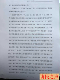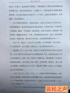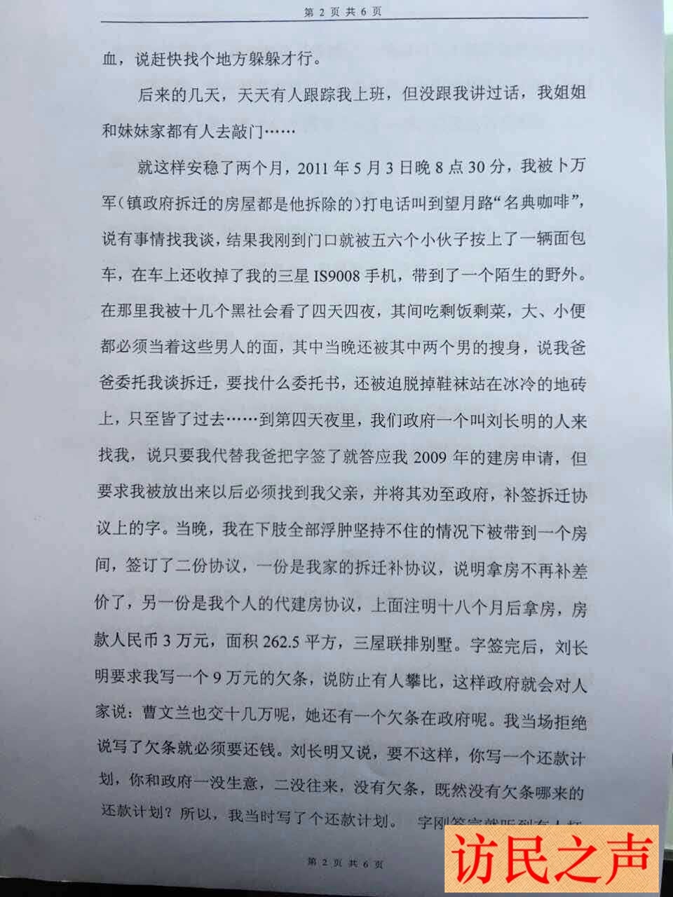 曹文兰受不了这样的折磨,第四天夜里,按照他们提出的条件签了协议,之后又交了钱。但她并没有拿到承诺给她的房子,每次她找到政府及信访局,都以房子是她们三姐妹的,给了她,她的姐妹会闹为由拒绝给房。2013年开始,曹文兰被迫上访维权。